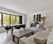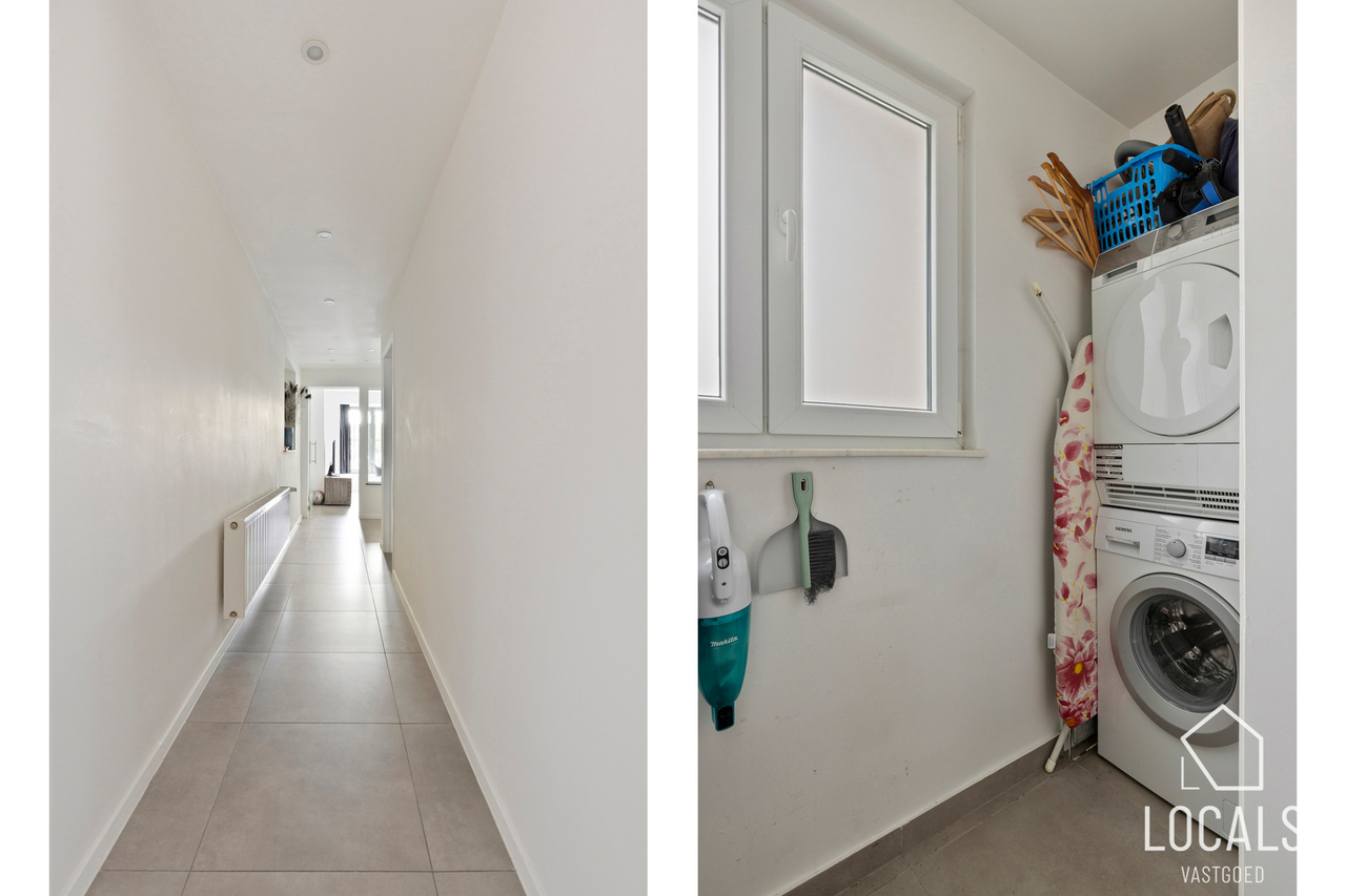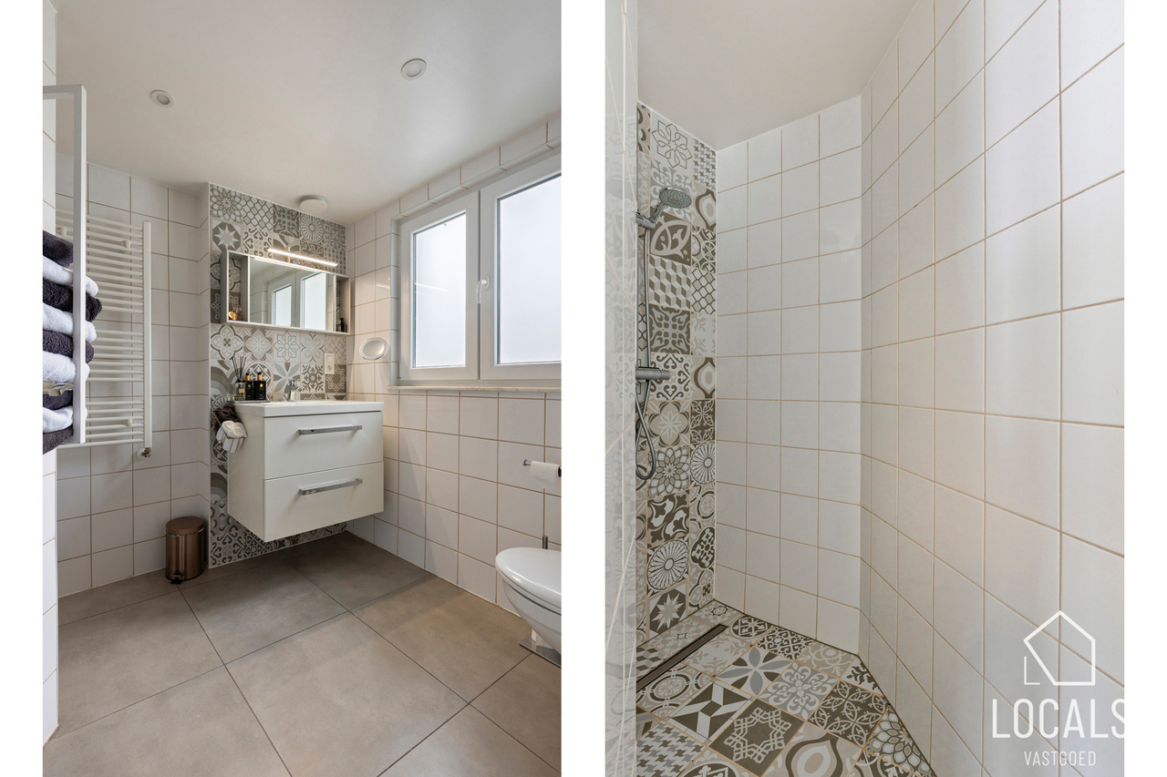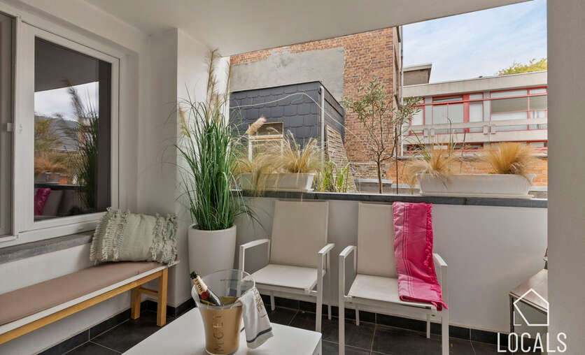 Het appartement zelf bevindt zich op de eerste verdieping en verwelkomt u met een gezellige leefruimte met eetplaats, waar licht en ruimte harmonieus samenkomen. De open keuken is uitgerust met alle courante toestellen en sluit naadloos aan op een praktische berging/wasplaats. De ruime master bedroom van maar liefst 16m² biedt volop comfort, terwijl de moderne badkamer is ingericht met een stijlvolle inloopdouche en kwaliteitsvolle afwerking. Op zonnige dagen vormt het aangename terras een heerlijke plek om te genieten van rust en privacy midden in de stad.