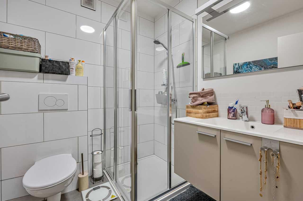 Het appartement bevat 1 slaapkamer, een lichtrijke leefruimte, een geïnstalleerde keuken, badkamer met wastafel en douche, een berging, afzonderlijk toilet en een ruim terras achteraan.