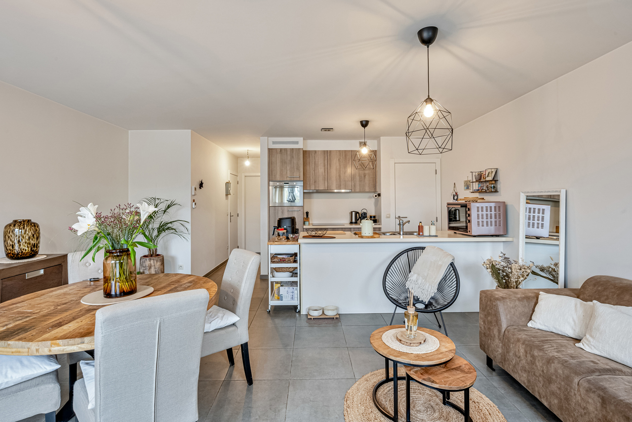 Het appartement bevat 1 slaapkamer, een lichtrijke leefruimte, een geïnstalleerde keuken, badkamer met wastafel en douche, een berging, afzonderlijk toilet en een ruim terras achteraan.