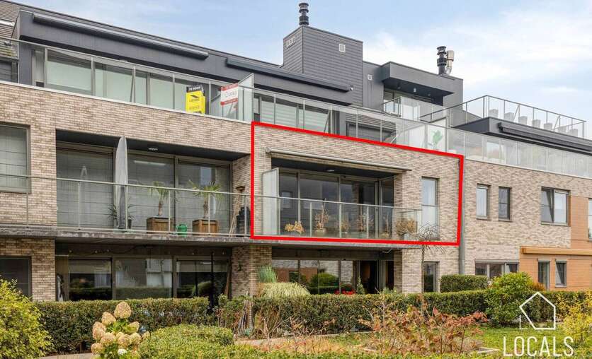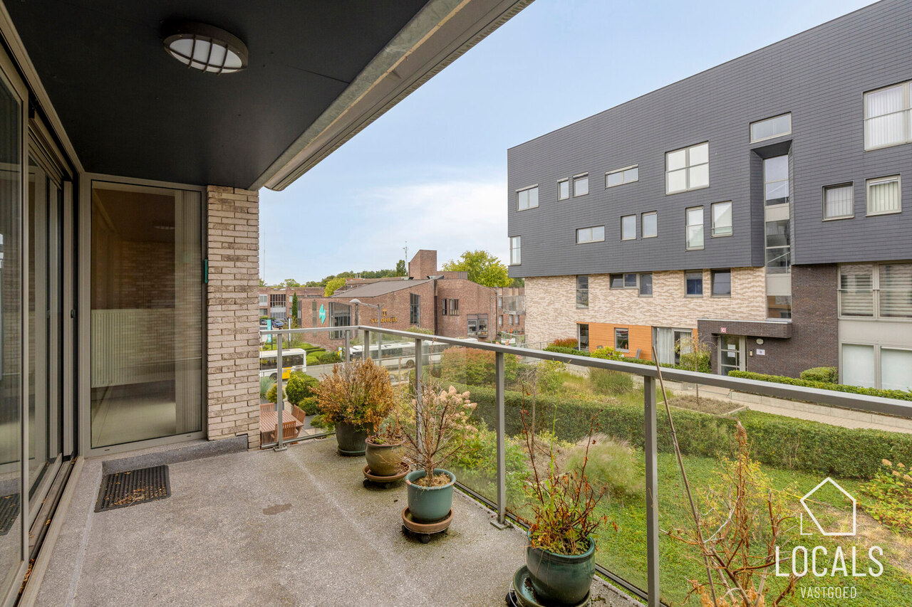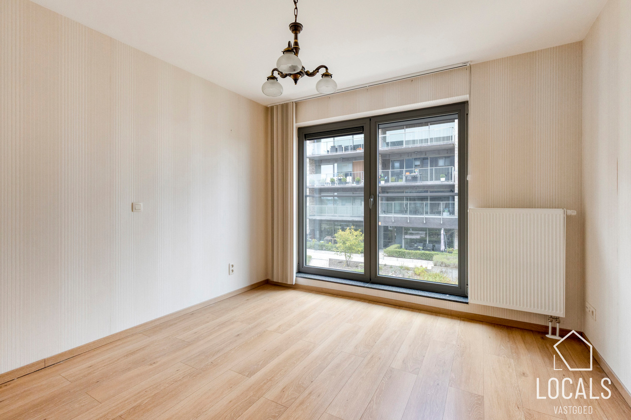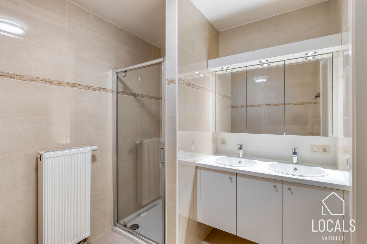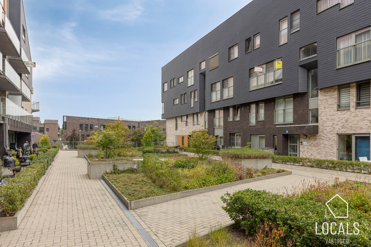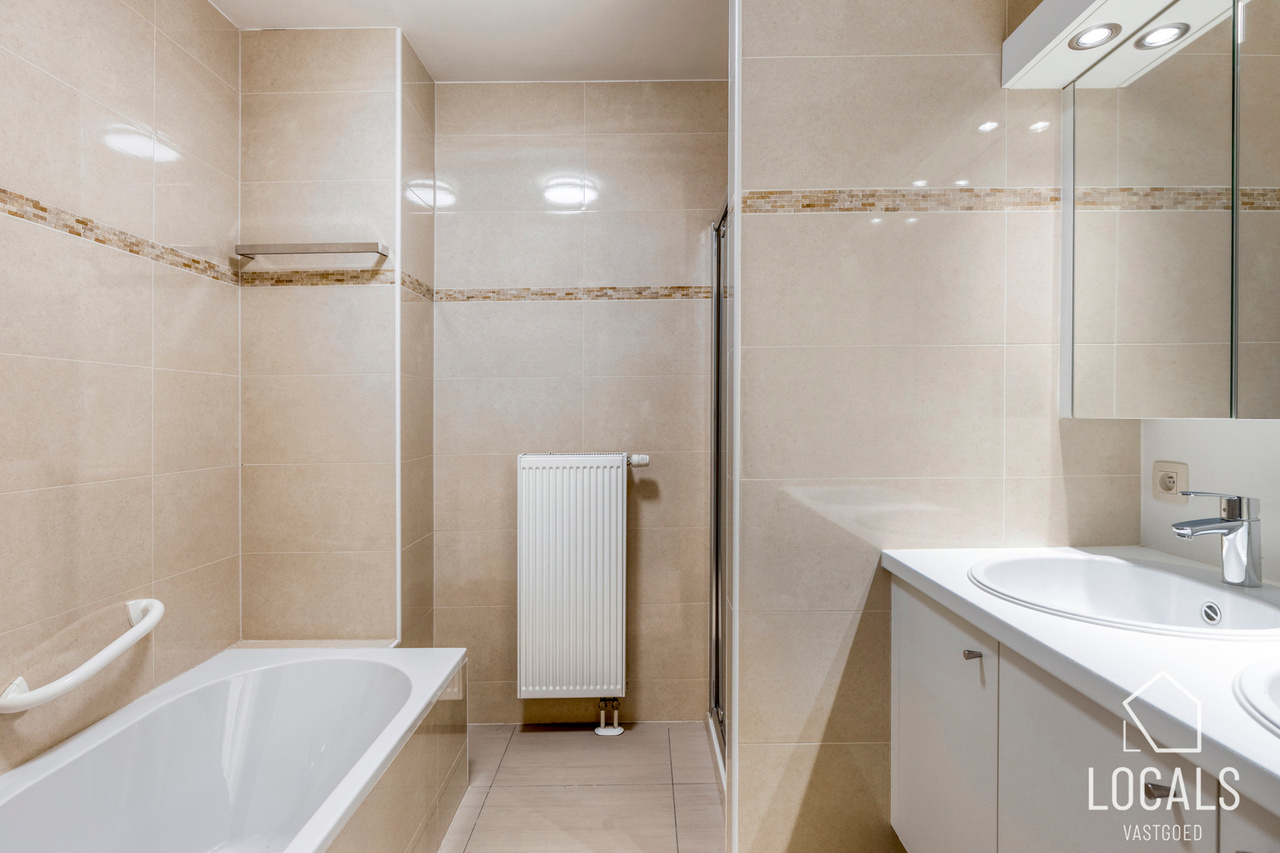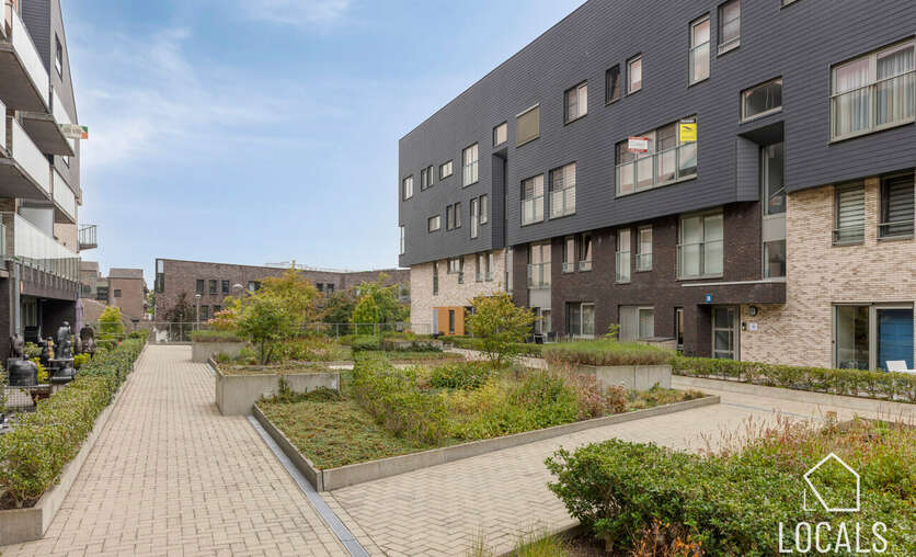 Bij het binnenkomen wordt u verwelkomd in een ruime inkomhal met gastentoilet. De lichtrijke leefruimte met grote raampartijen vloeit harmonieus over in de open keuken, die volledig werd uitgerust met alle courante toestellen. Aansluitend vindt u een praktische berging/wasplaats. Het appartement beschikt bovendien over een zonnig terras met prachtig zicht op één van de groene gemeenschappelijke tuinen. Verder zijn er twee ruime slaapkamers en een smaakvolle badkamer met dubbele lavabo, ligbad en aparte douchecabine.