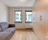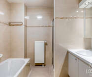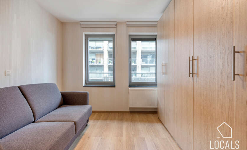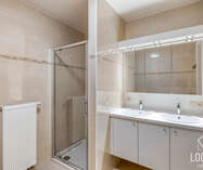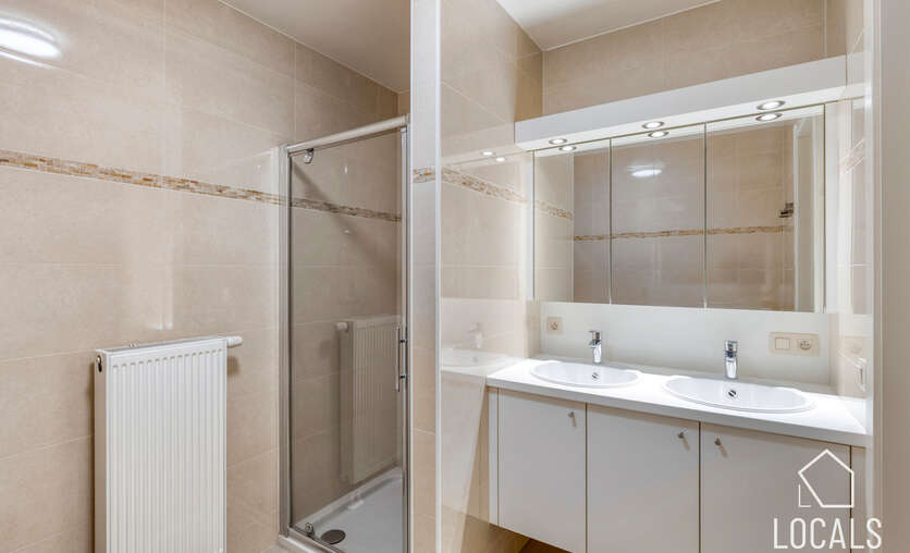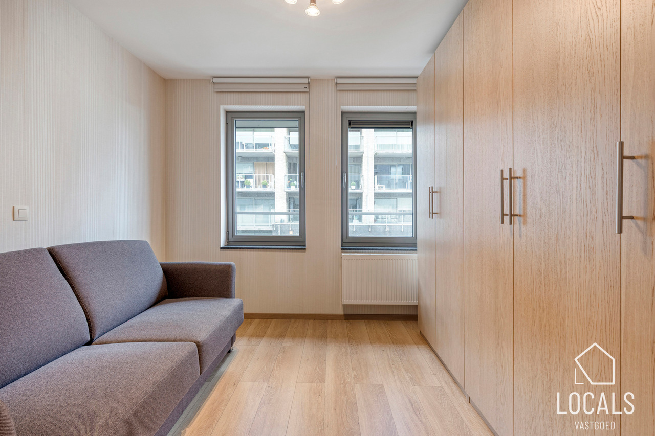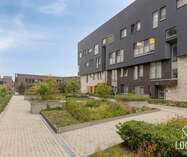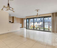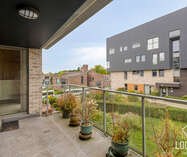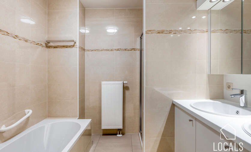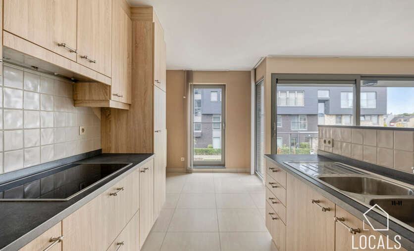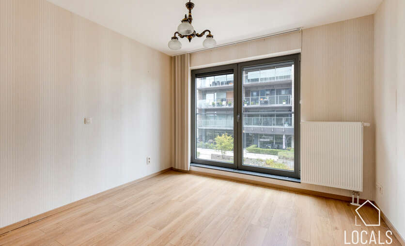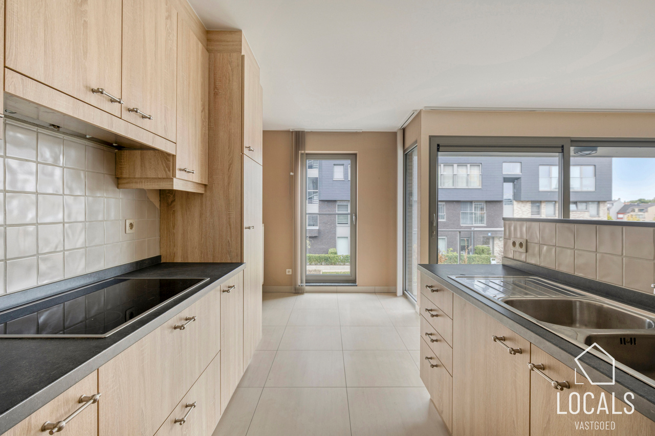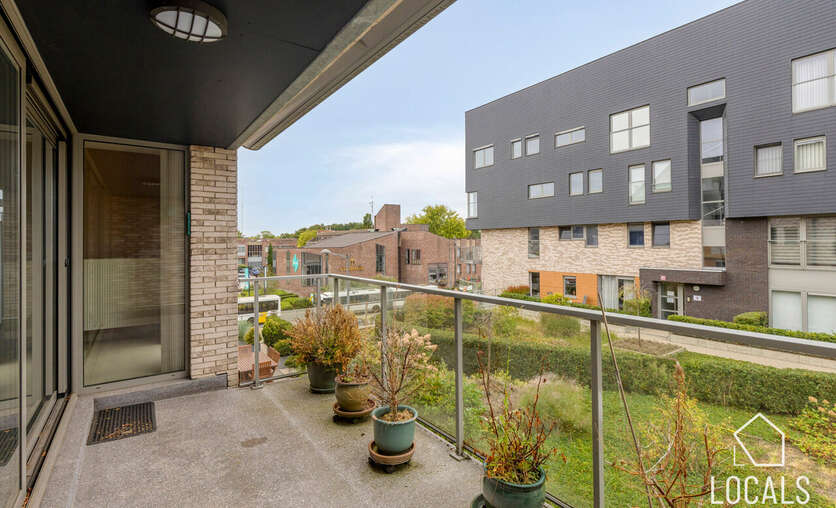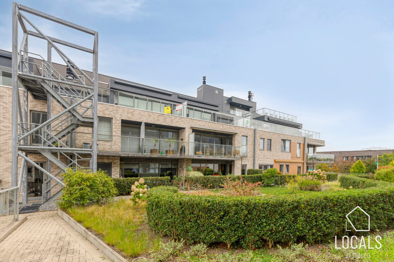 Bij het binnenkomen wordt u verwelkomd in een ruime inkomhal met gastentoilet. De lichtrijke leefruimte met grote raampartijen vloeit harmonieus over in de open keuken, die volledig werd uitgerust met alle courante toestellen. Aansluitend vindt u een praktische berging/wasplaats. Het appartement beschikt bovendien over een zonnig terras met prachtig zicht op één van de groene gemeenschappelijke tuinen. Verder zijn er twee ruime slaapkamers en een smaakvolle badkamer met dubbele lavabo, ligbad en aparte douchecabine.