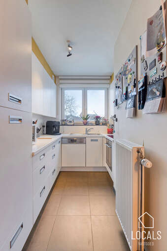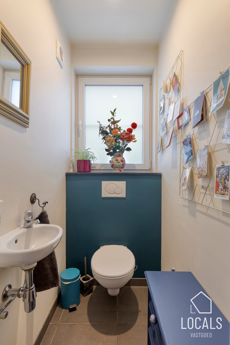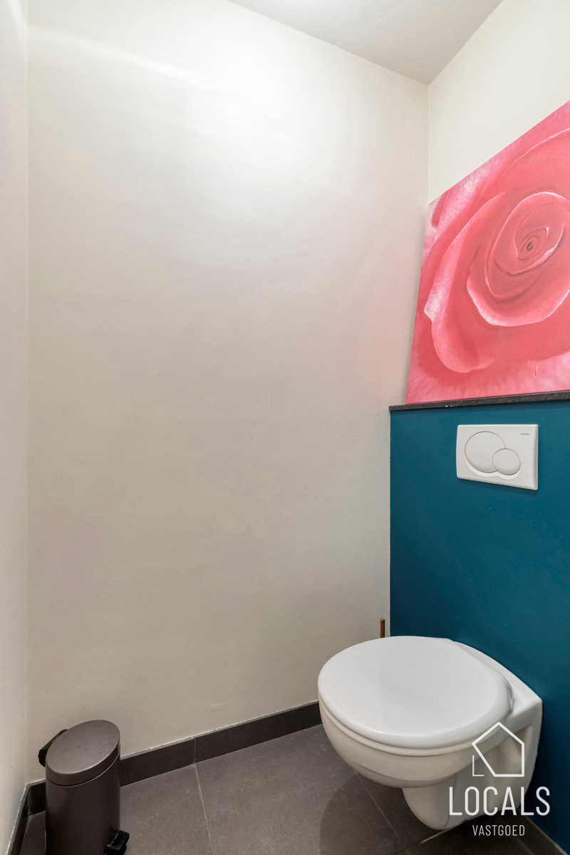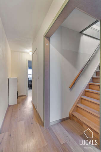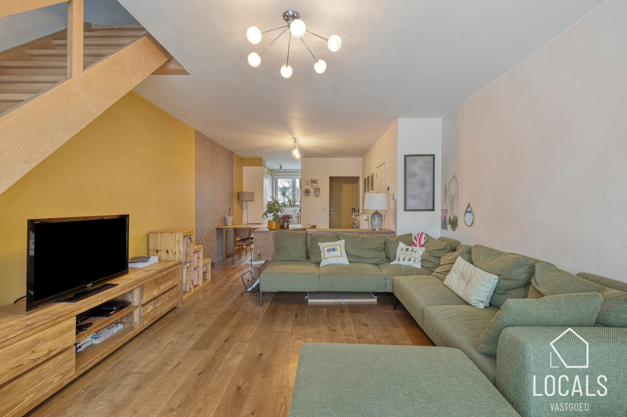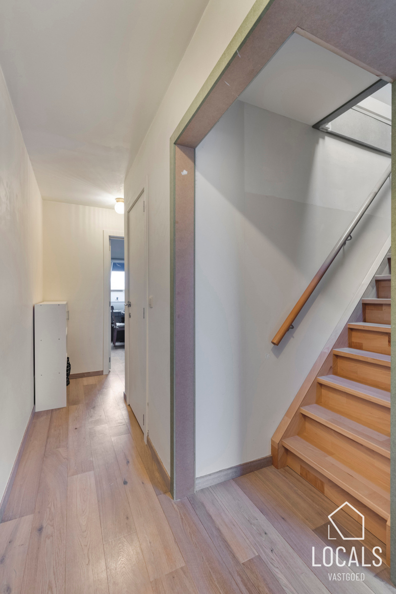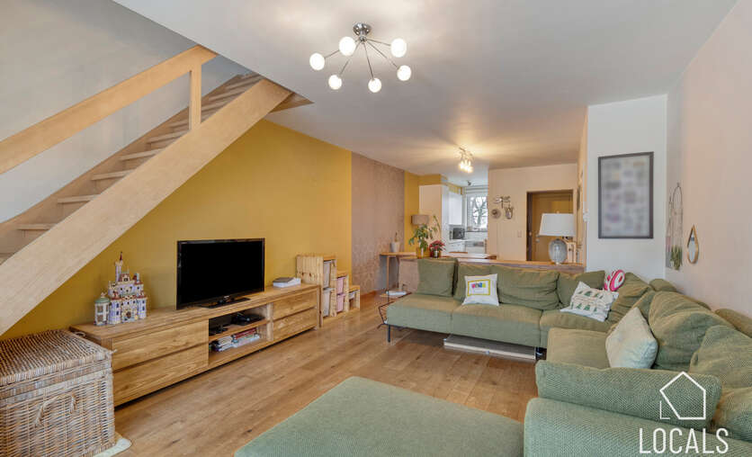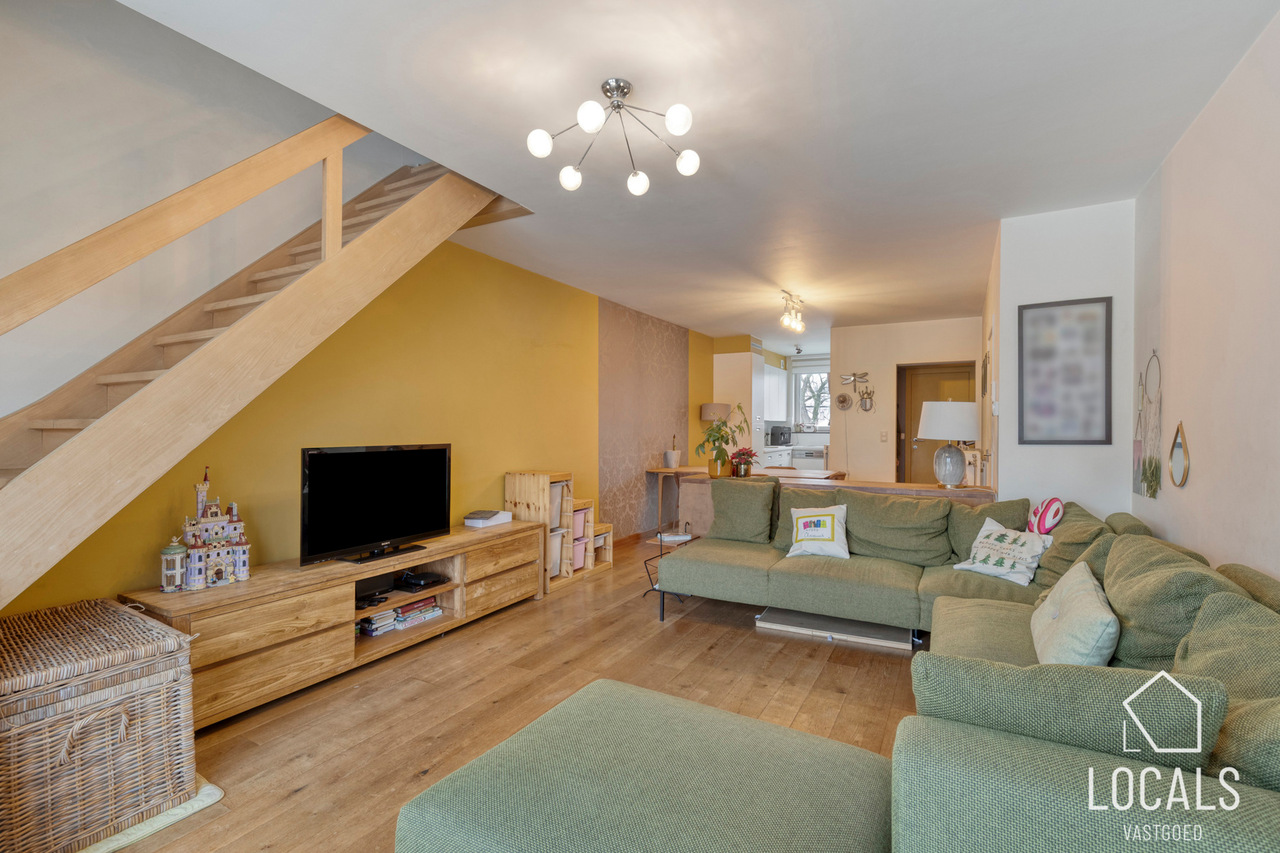De eerste verdieping omvat de lichtrijke leefruimte met zit- en eetgedeelte, een volledig geïnstalleerde keuken en een apart toilet. Vanop de 1ste verdieping heeft u prachtig verzicht op groen en is de tuin ook bereikbaar.