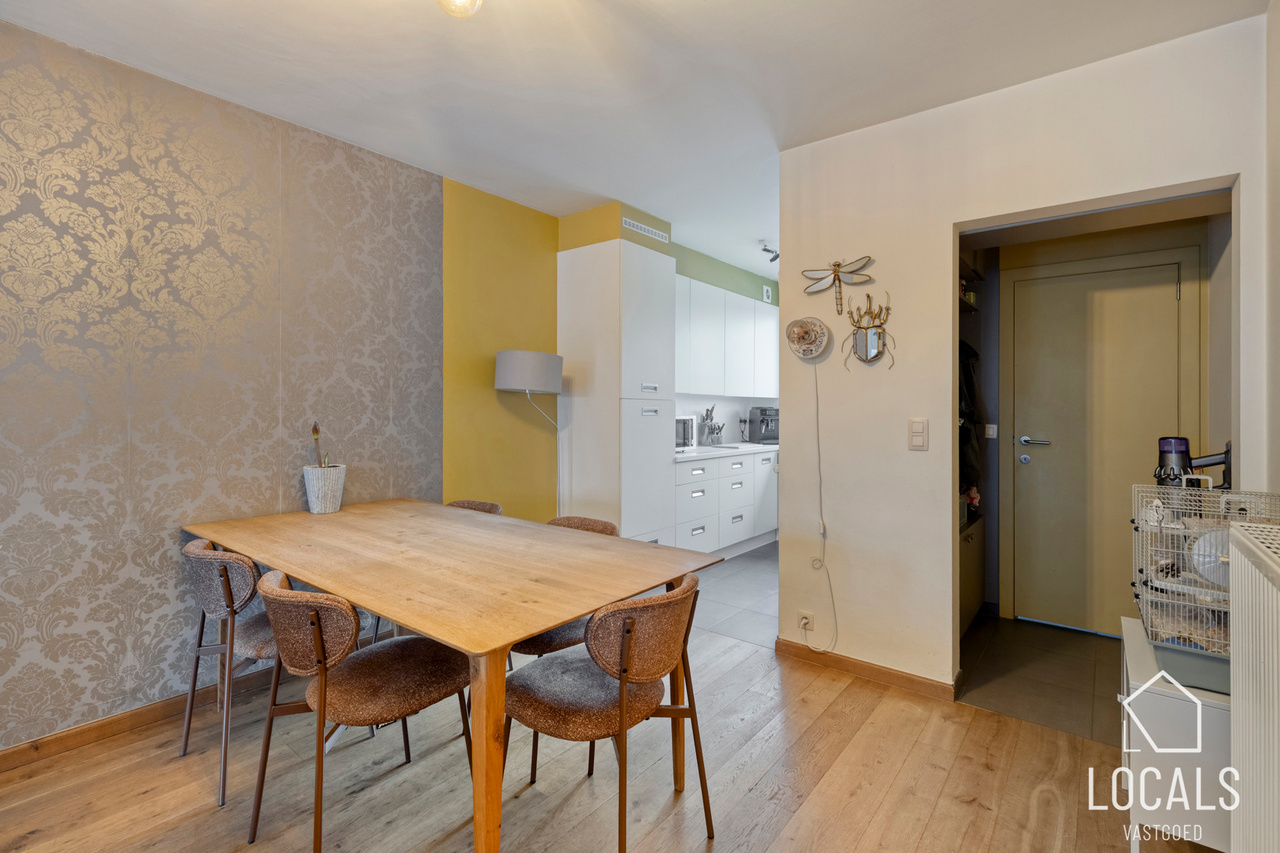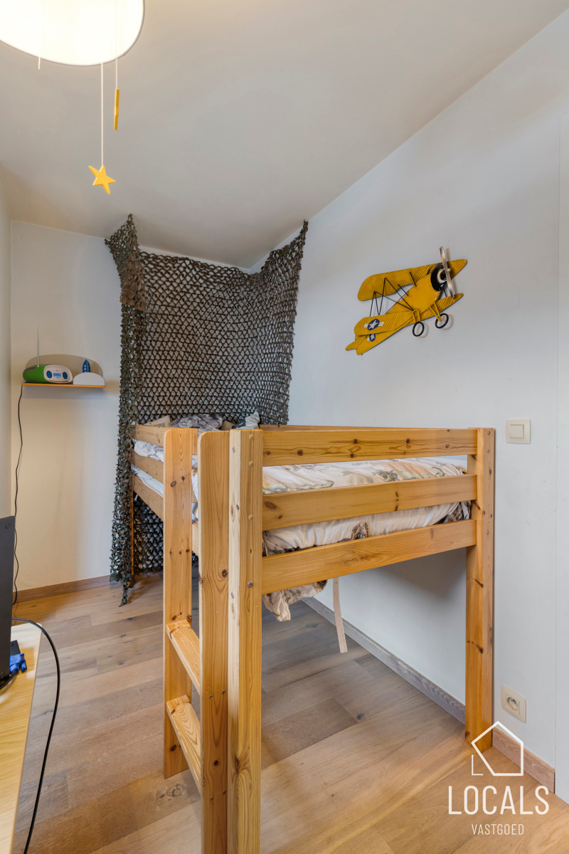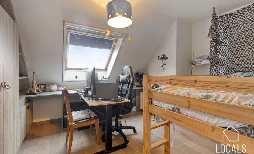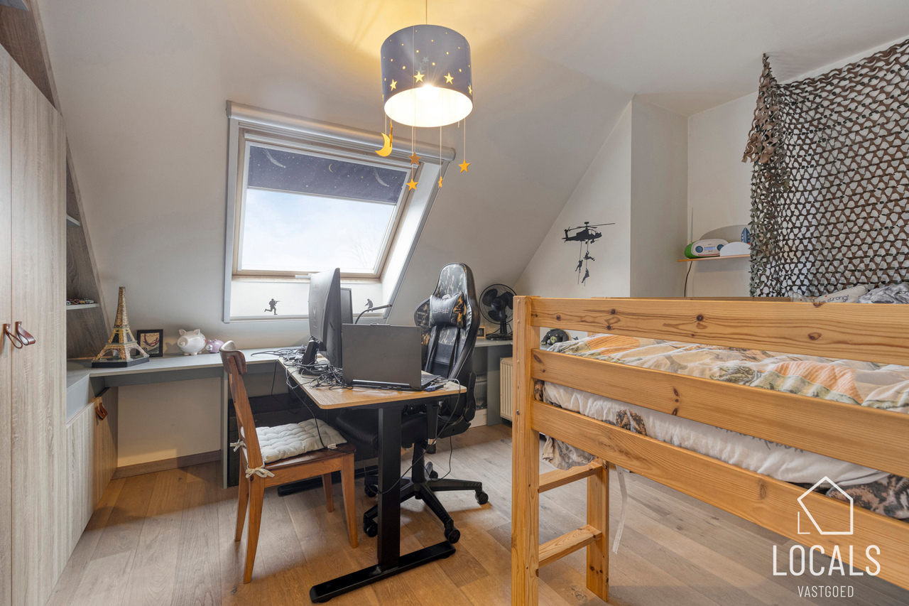 Enkele troeven: gunstig EPC-label B, conforme elektriciteit, zonnepanelen, 2 slaapkamers en een extra zolderkamer, een onderhoudsvriendelijke tuin met verzicht op groen, ruime garage, veel bergruimte, ventilatiesysteem in de volledige woning en twee privatieve staanplaatsen voor de deur. De woning is bovendien afgewerkt met kwaliteitsvolle materialen, waaronder parketvloeren.