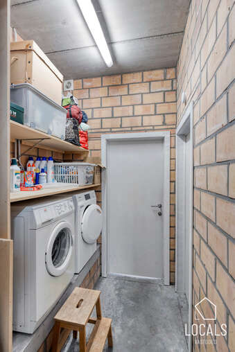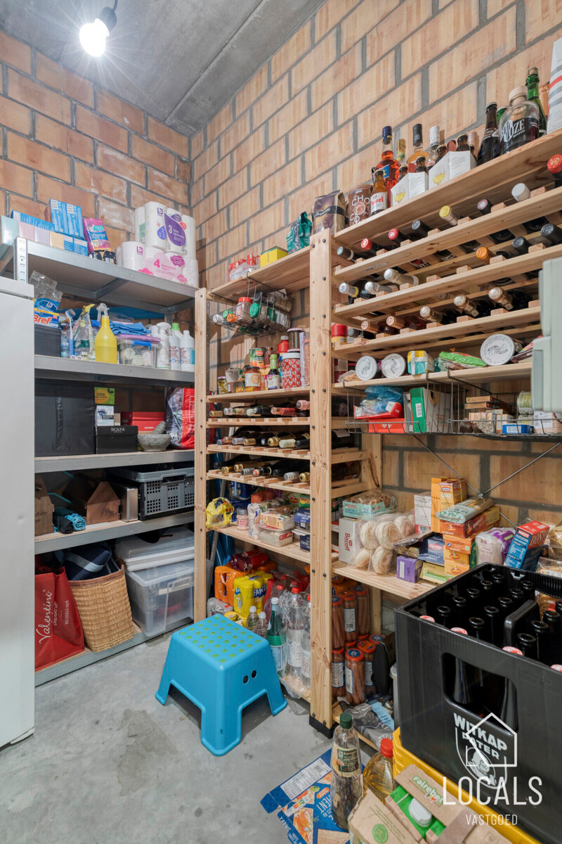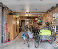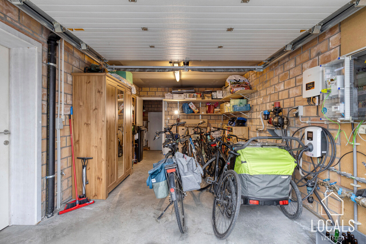 Op het gelijkvloers bevindt zich een ruime garage met elektrische poort en aansluitingen voor wasmachine en droogkast, een praktische berging en een bureauruimte met bijkeuken en ingemaakte kasten. Vanuit deze verdieping heeft u toegang tot de onderhoudsvriendelijk tuin en terras.
