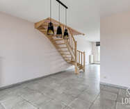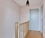 Bij het binnenkomen van het appartement betreedt u de eerste verdieping via een ruime inkomhal met apart gastentoilet en praktische ingemaakte kast. Aansluitend bevindt zich de lichtrijke leefruimte met zit- en eetgedeelte en de volledig geïnstalleerde open keuken. Deze verdieping beschikt over twee terrassen: een gezellig terras aan de voorzijde en een ruim zuidgericht terras van 13,5 m² aan de achterzijde, beide met zicht op groen.