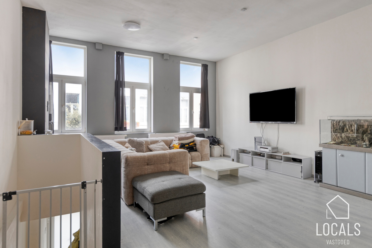Het appartement heeft een bewoonbare oppervlakte van ca. 125m² en omvat een ruime leefruimte van 50m² met aansluitend de keuken en wasplaats. Verder is er een klein terras aanwezig. Op het tussenverdiep bevindt zich de badkamer met inloopdouche, lavabo en toilet. De tweede verdieping telt twee zeer ruime slaapkamers en biedt toegang tot de zolder, ideaal als stockage. Het appartement is momenteel verhuurd aan €780/maand.