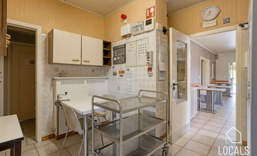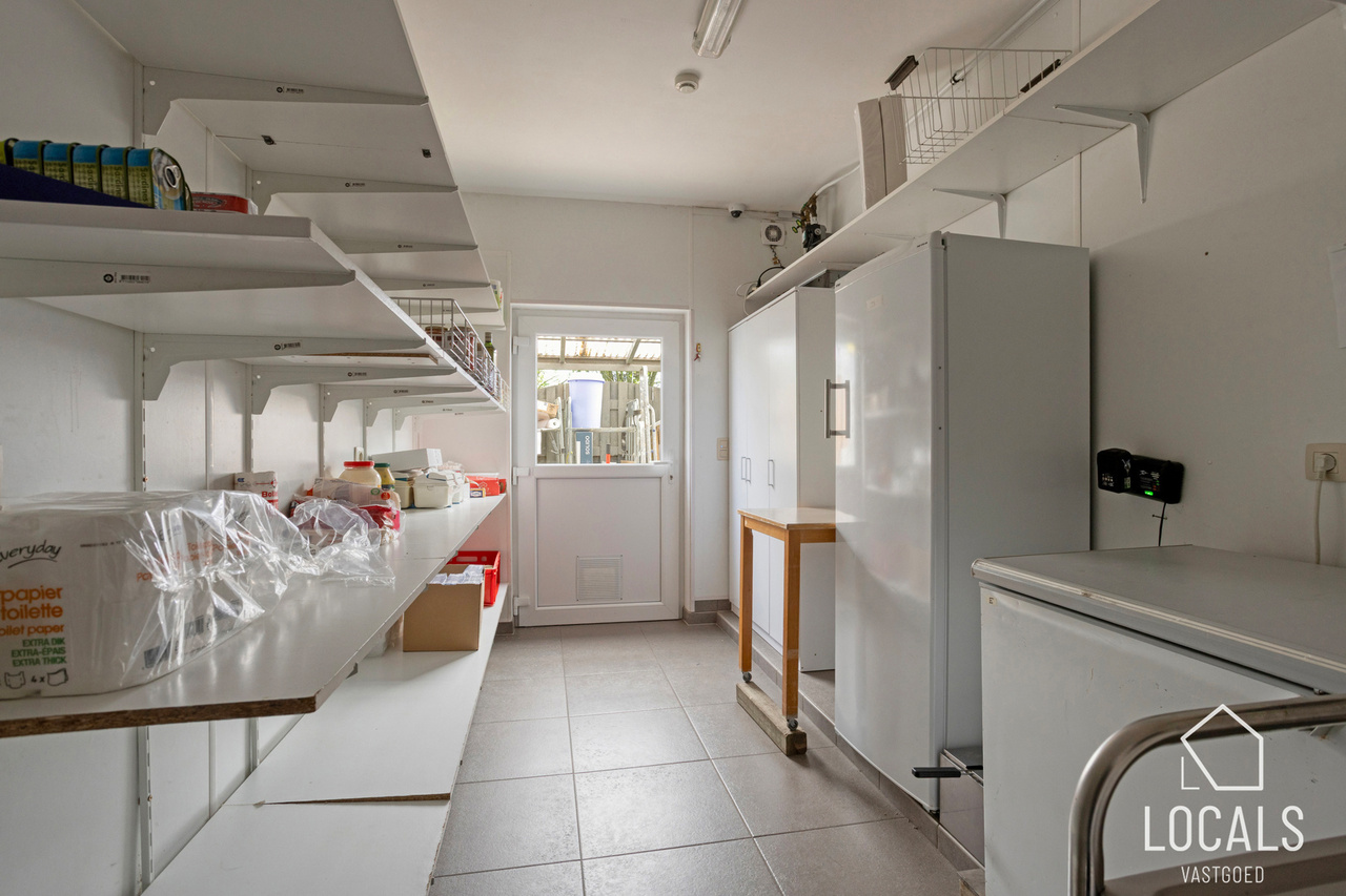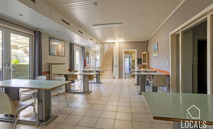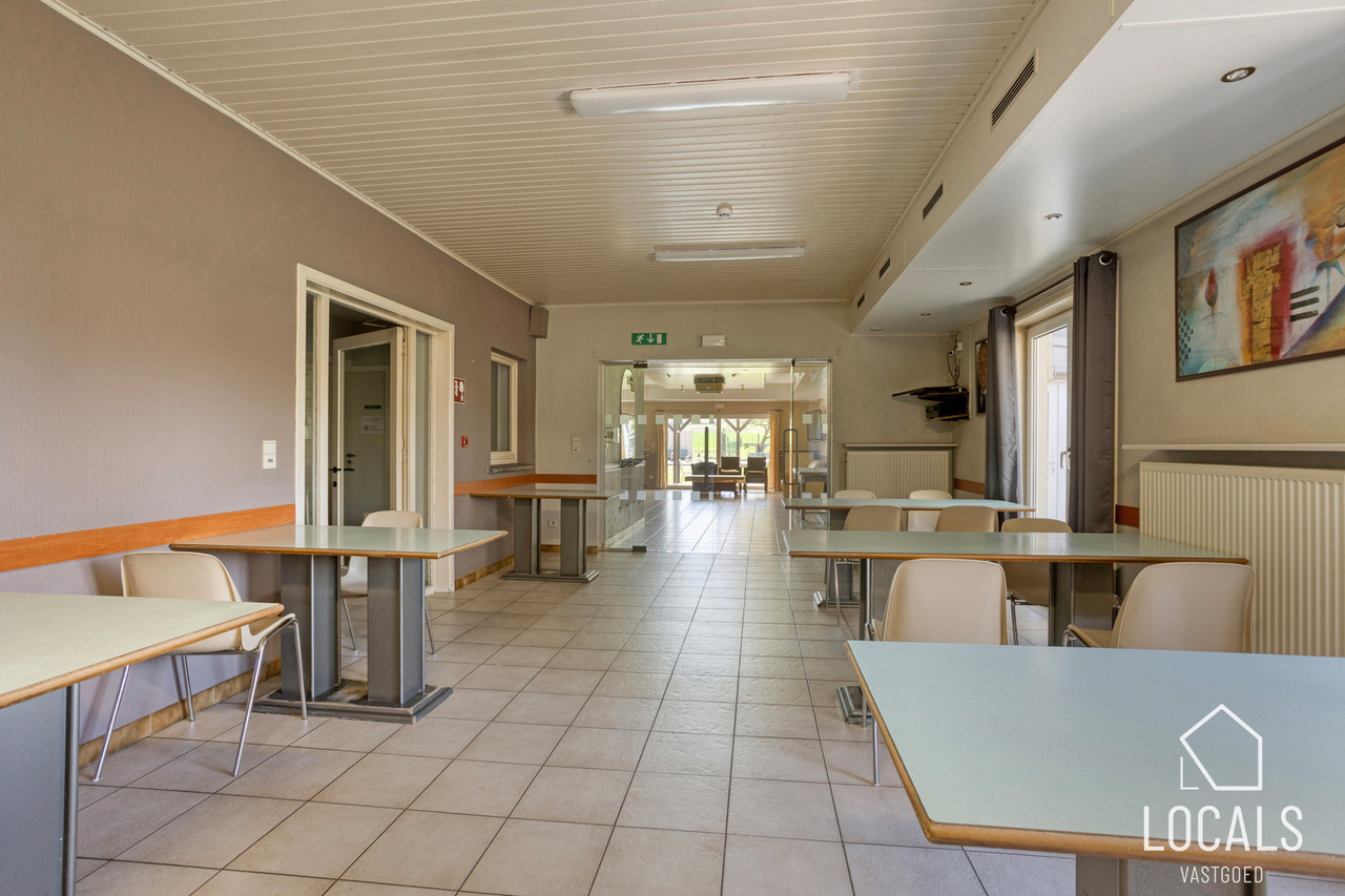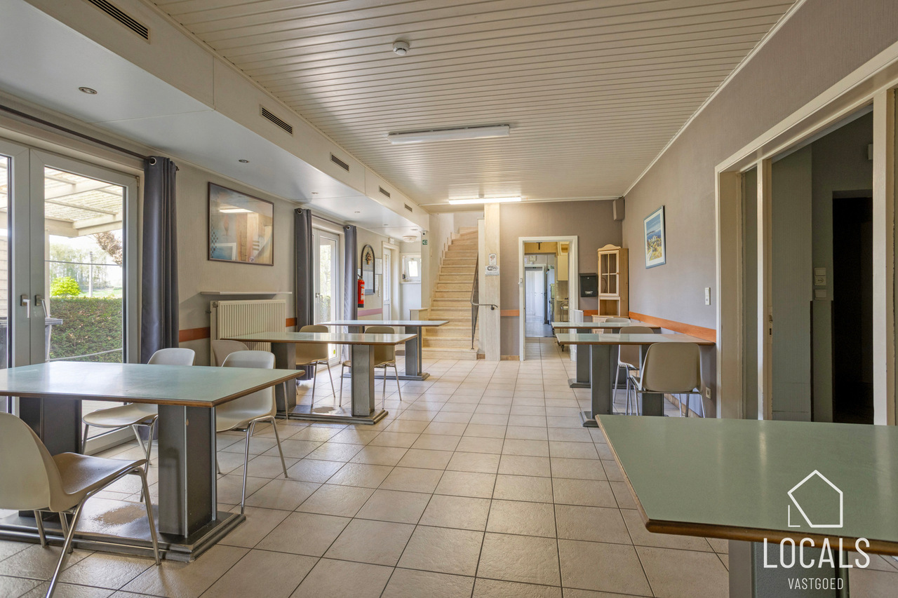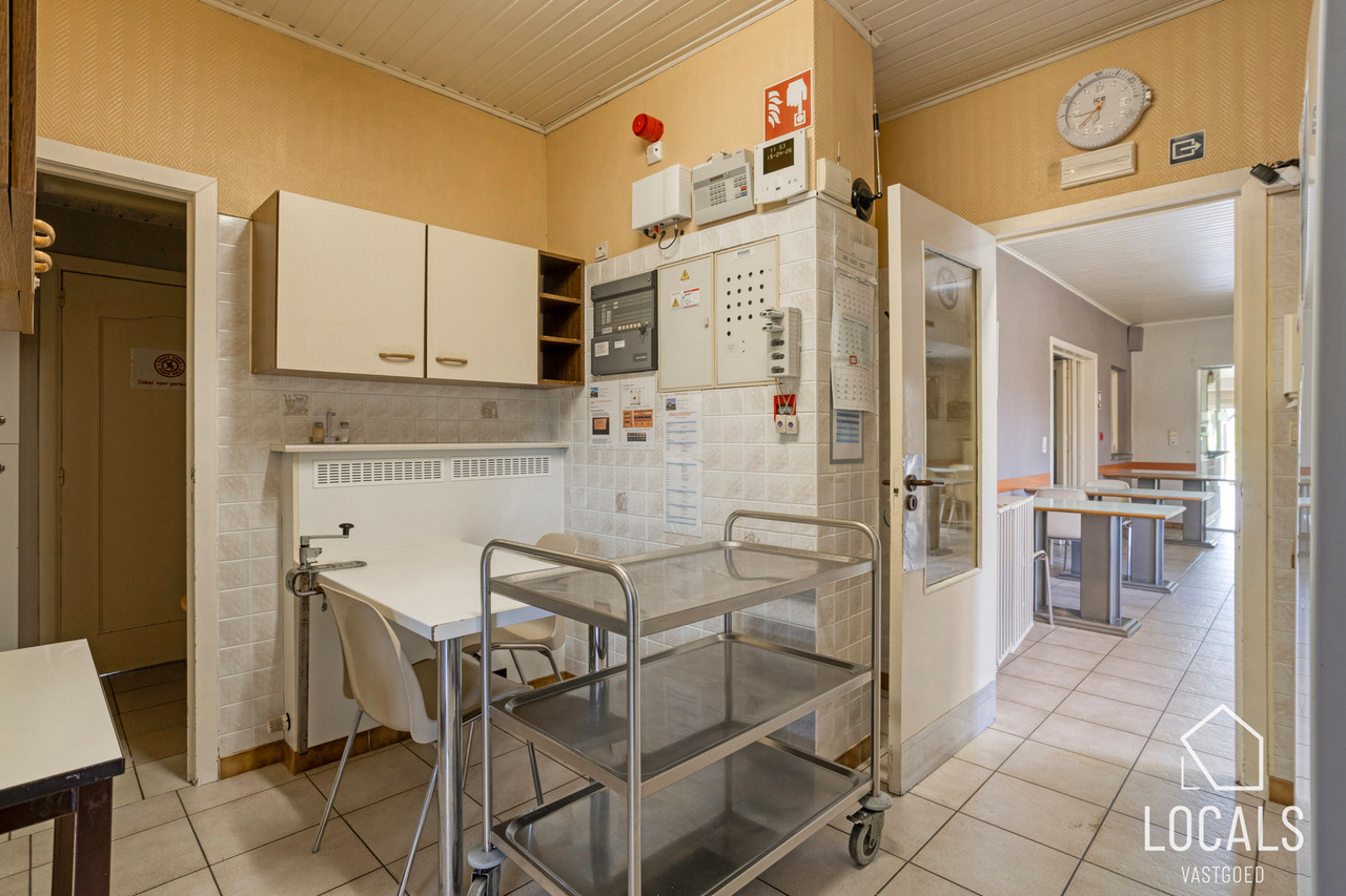 Met een bewoonbare oppervlakte van ca. 766 m² biedt het gebouw een bijzonder ruime en functionele indeling. Het beschikt over 24 slaapkamers, een grootkeuken, een verpleegpost, een ruime refter, een aangename ontspanningsruimte en een bureelgedeelte vooraan met aparte vergaderruimte — ideaal voor administratie, overleg en begeleiding.