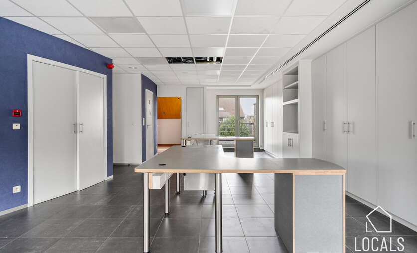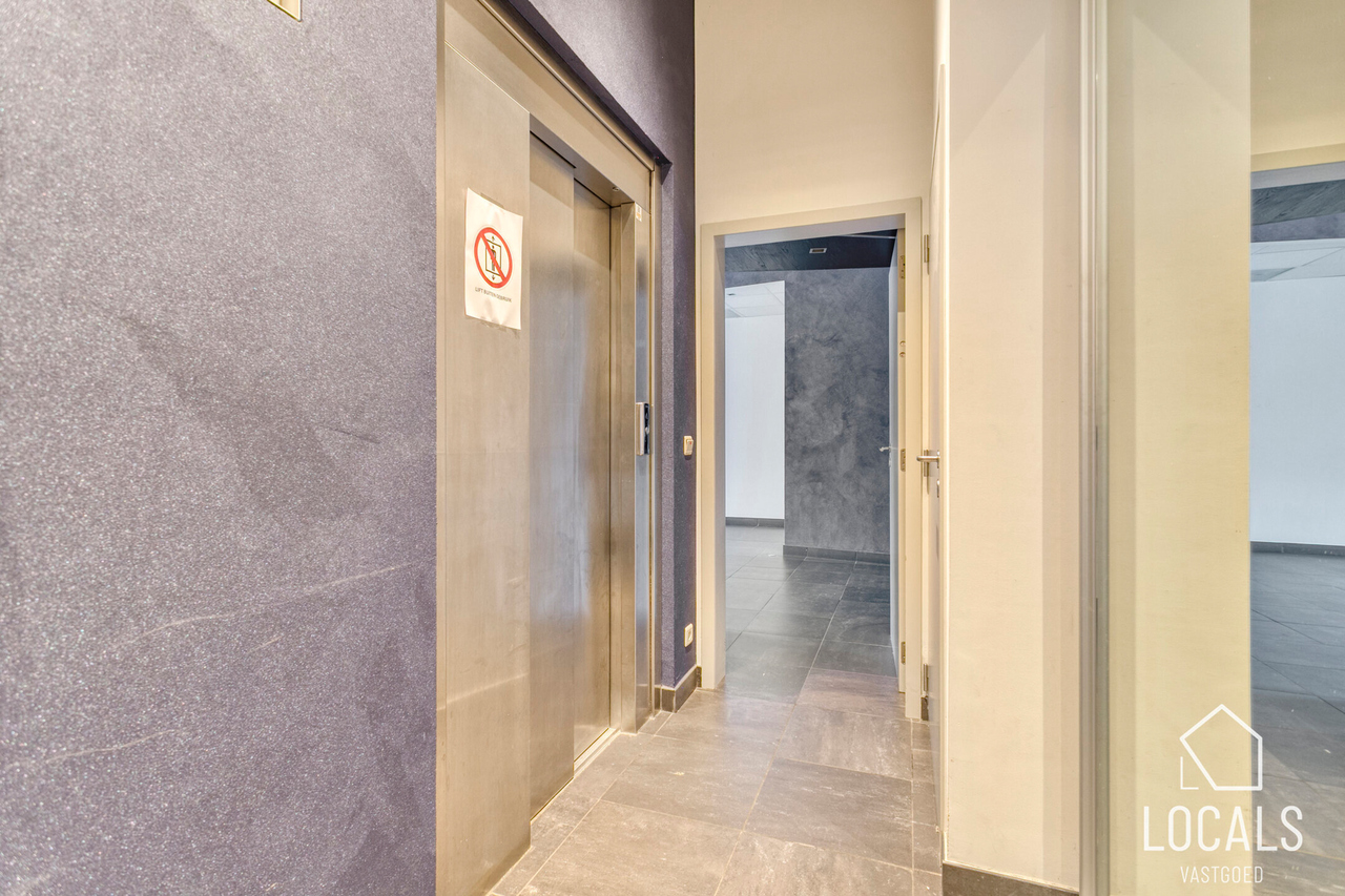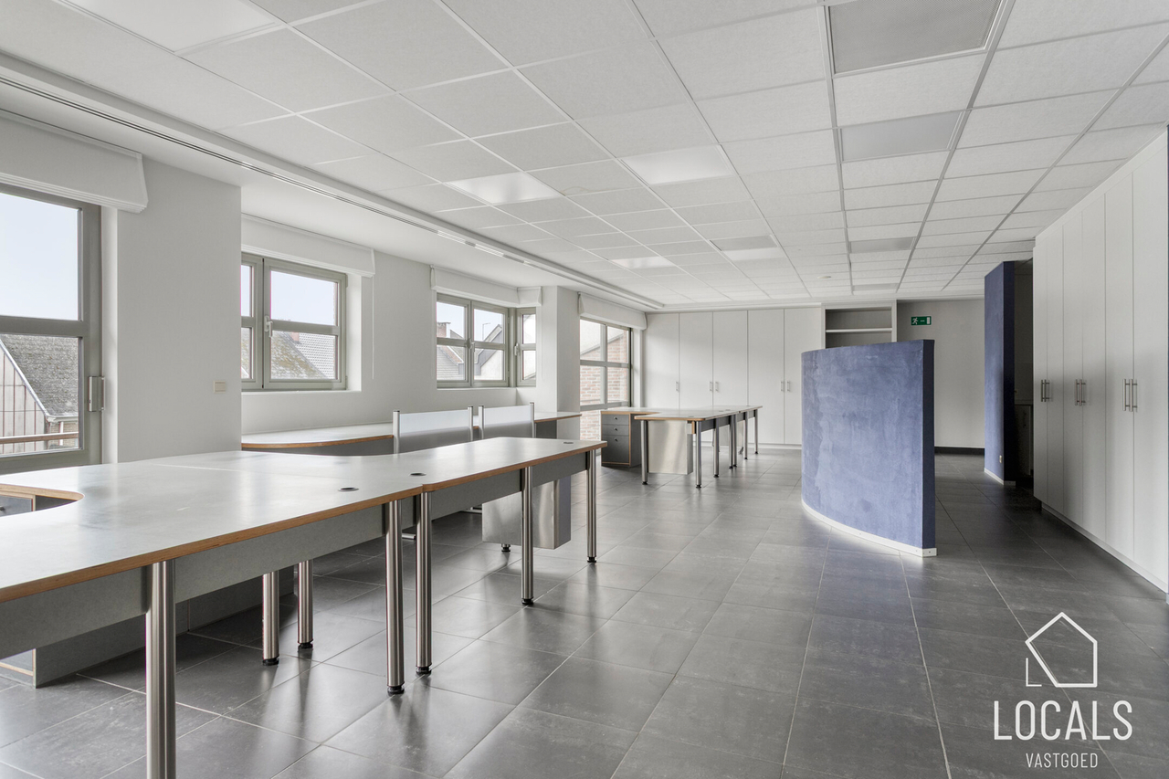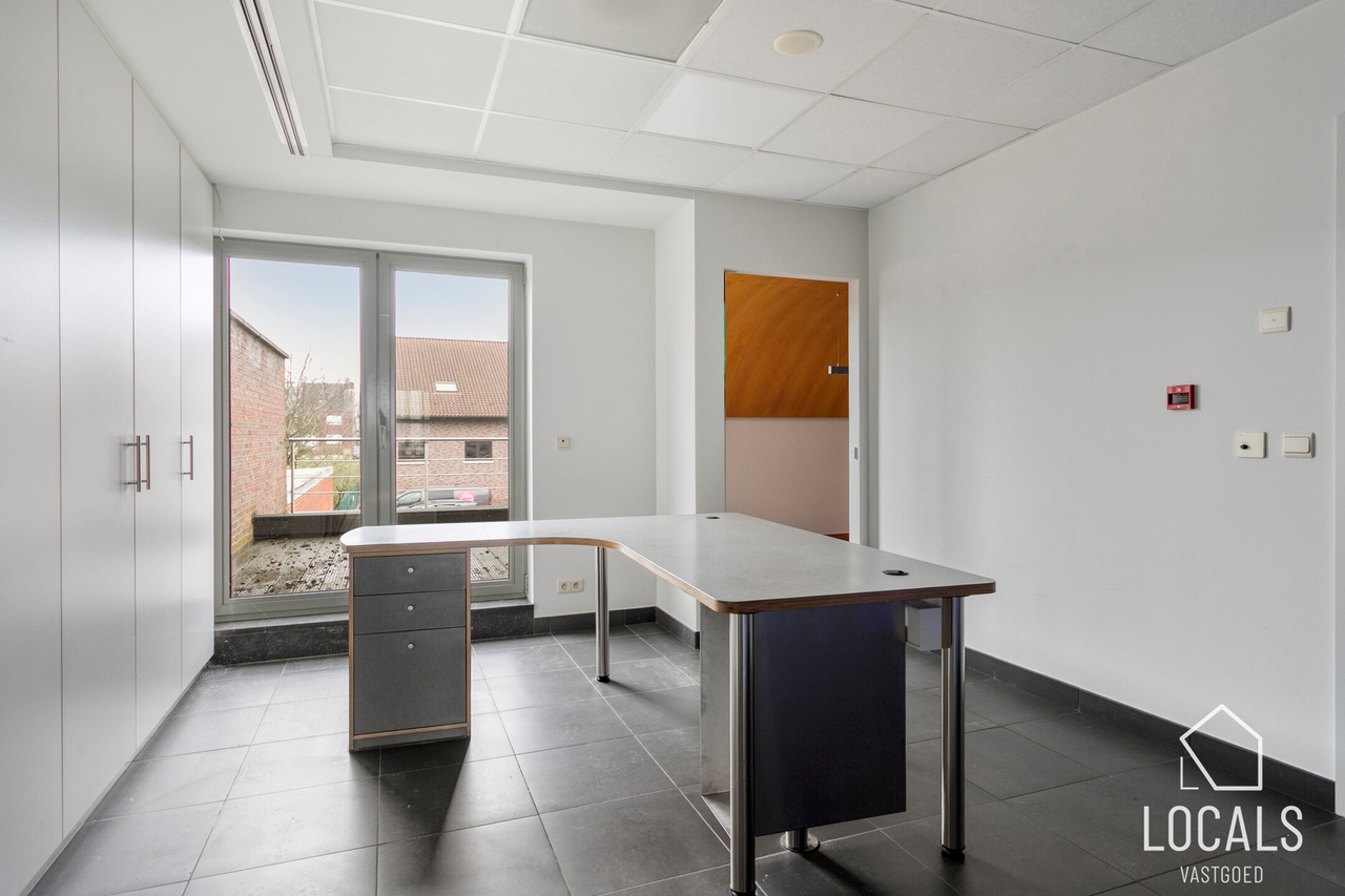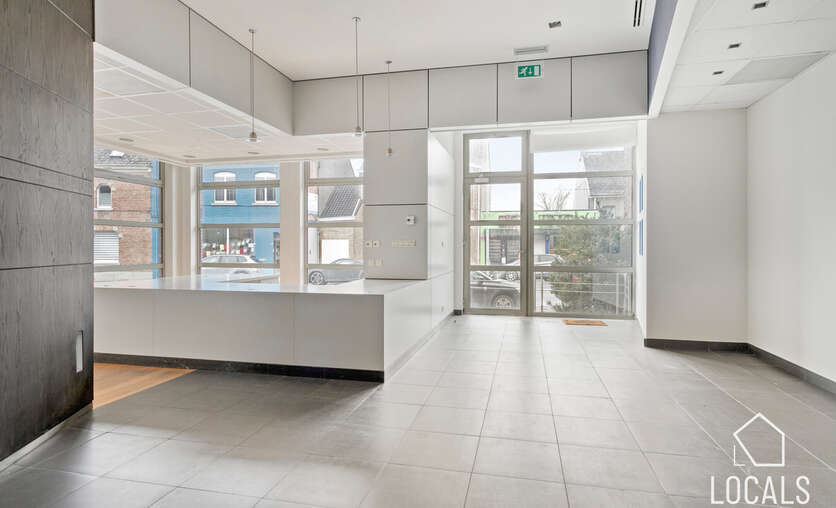 Op het gelijkvloers bevindt zich een handelsruimte, momenteel ingericht als kantoorruimte, dit met aparte bureaus, keuken, terras en toilet. De verdieping werd momenteel samengevoegd als kantoorruimte, dit kan terug worden opgesplitst naar 2 appartementen, telkens met 2 slaapkamers en een eigen terras. Op de 2e verdieping bevindt zich een ruim appartement met 2 slaapkamers en terras. Diverse staanplaatsen achter het gebouw. Lift en dubbele beglazing aanwezig.