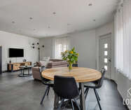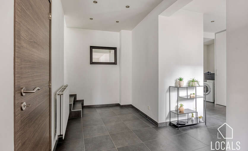 Het gelijkvloers verwelkomt je met een ruime en lichtrijke leefruimte die naadloos aansluit op de stijlvolle open keuken. Daarnaast vind je er een praktische berging met maatkasten die ook dienstdoet als wasplaats, een gastentoilet en de toegang tot de droge kelder die ideaal is als extra bergruimte. Via de tussenhal kom je uit op het aangename terras, volledig afsluitbaar met een elektrische poort.