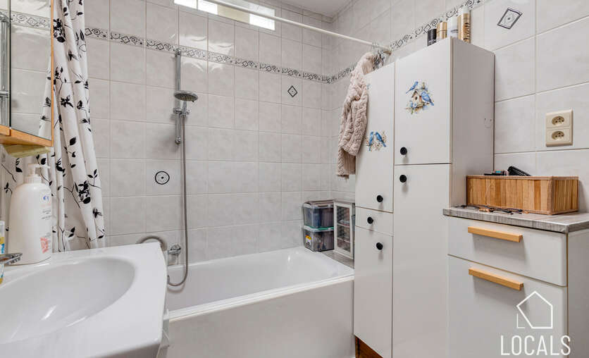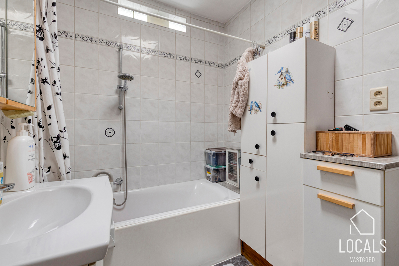 Bij het betreden van de woning kom je binnen in de inkomhal die toegang biedt tot de lichtrijke leefruimte. Aansluitend bevindt zich de geïnstalleerde keuken, uitgerust met een vaatwasser, oven en inductiekookplaat. Verder vinden we op het gelijkvloers een apart toilet, een praktische badkamer met douchebad, en een handige bergplaats met aansluiting voor een wasmachine.