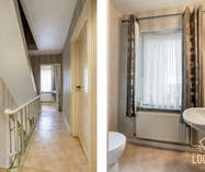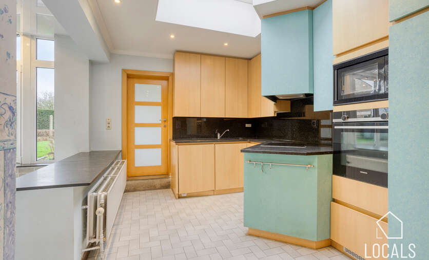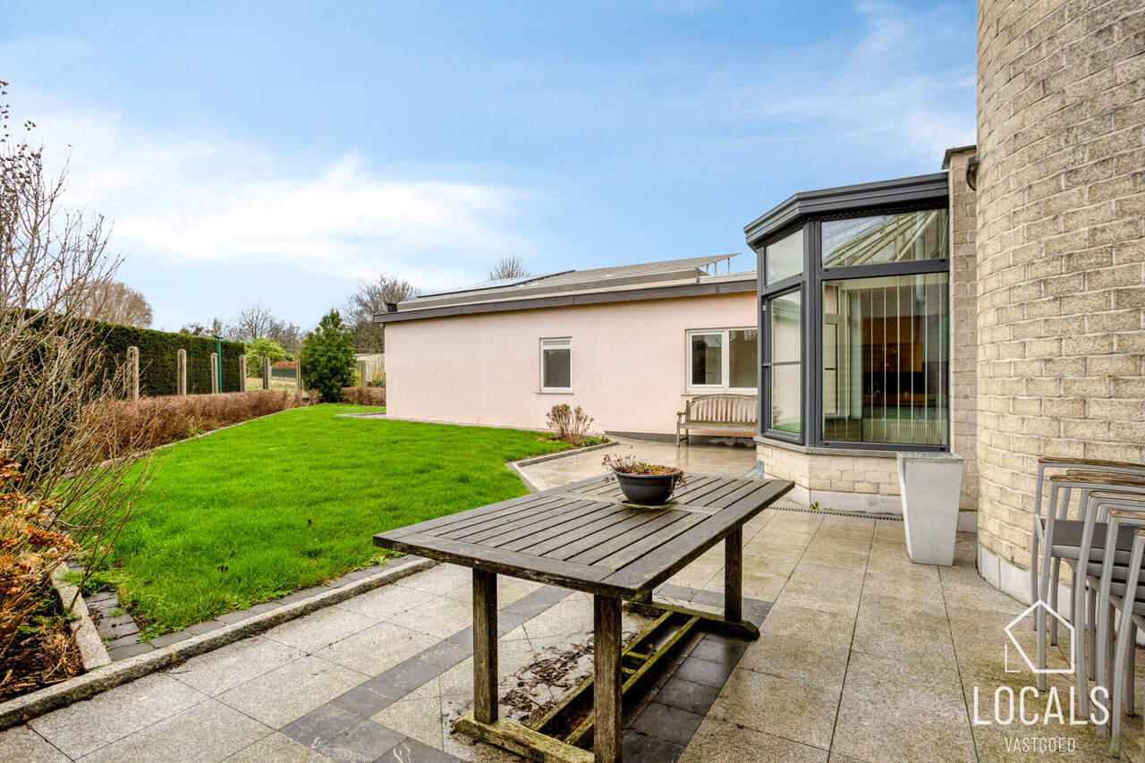 De volledig geïnstalleerde moderne keuken sluit hier perfect op aan. Verder treffen we nog de doorgang naar de kelder, een handige berging en de badkamer uitgerust met toilet/ligbad/lavabomeubel en douchecabine. Op de eerste verdieping bevinden zich vier slaapkamers, waaronder een royale master bedroom van 30m², een extra berging en een tweede toilet.