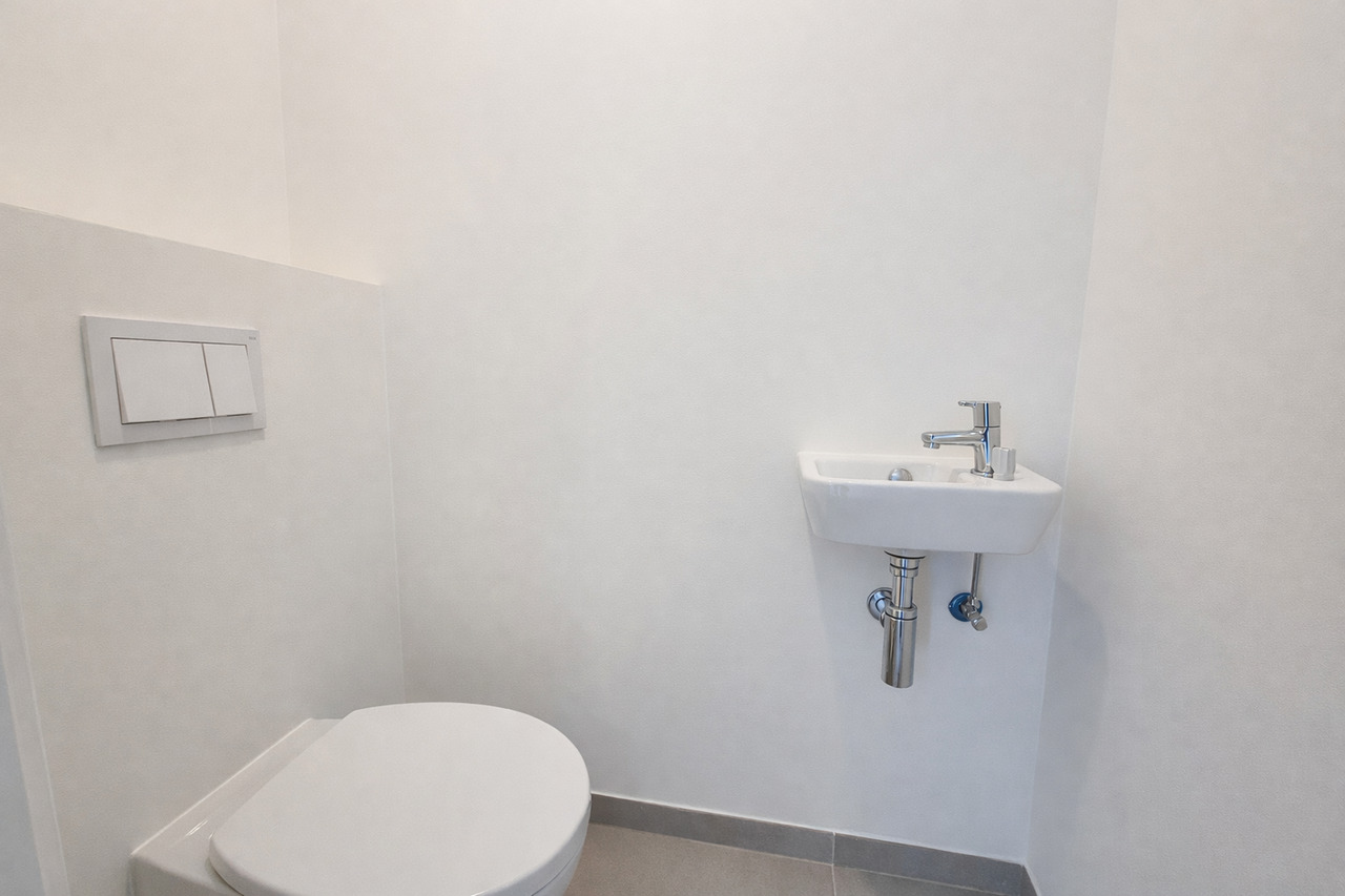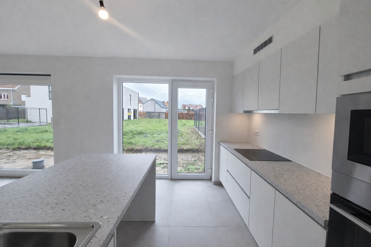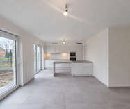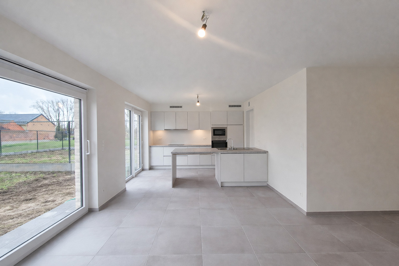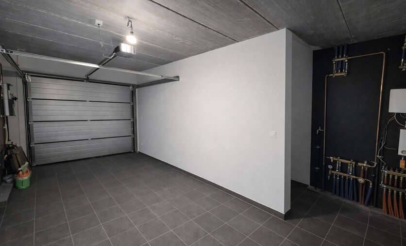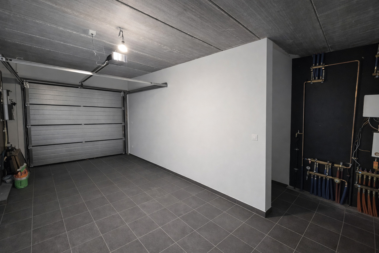 Op het gelijkvloers vormt de open leefruimte het hart van de woning. De zithoek, eethoek en keuken vloeien naadloos in elkaar over en creëren een lichte, ruime leefomgeving waar je elke dag opnieuw tot rust komt. De grote raampartijen zorgen voor een optimale lichtinval en een directe connectie met de tuin. Een praktische inkomhal, gastentoilet en inpandige garage maken het gelijkvloers compleet en verhogen het dagelijkse comfort.