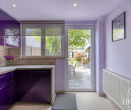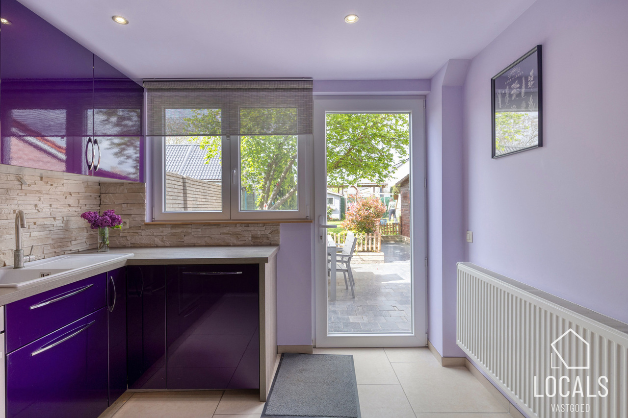 Bij het binnenkomen komt u in de gezellige, lichtrijke leefruimte met houtkachel, die naadloos overgaat in de eetruimte. Achter de eetruimte bevindt zich de ruime badkamer, uitgerust met wasmachineaansluiting, toilet, douchebad en een dubbel lavabomeubel. Aansluitend vindt u de volledig geïnstalleerde keuken met zicht op en toegang tot de onderhoudsvriendelijke tuin. De garage sluit rechtstreeks aan op de keuken, wat het uitladen van boodschappen bijzonder praktisch maakt.