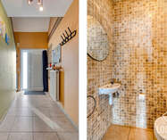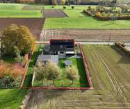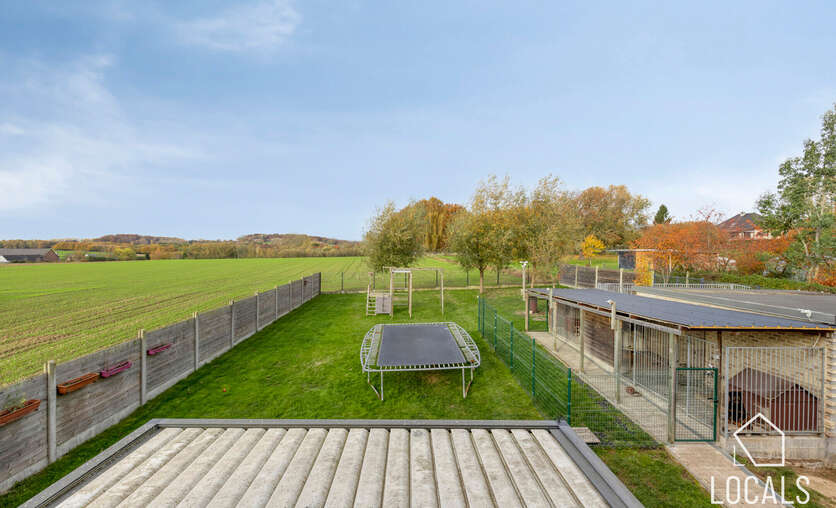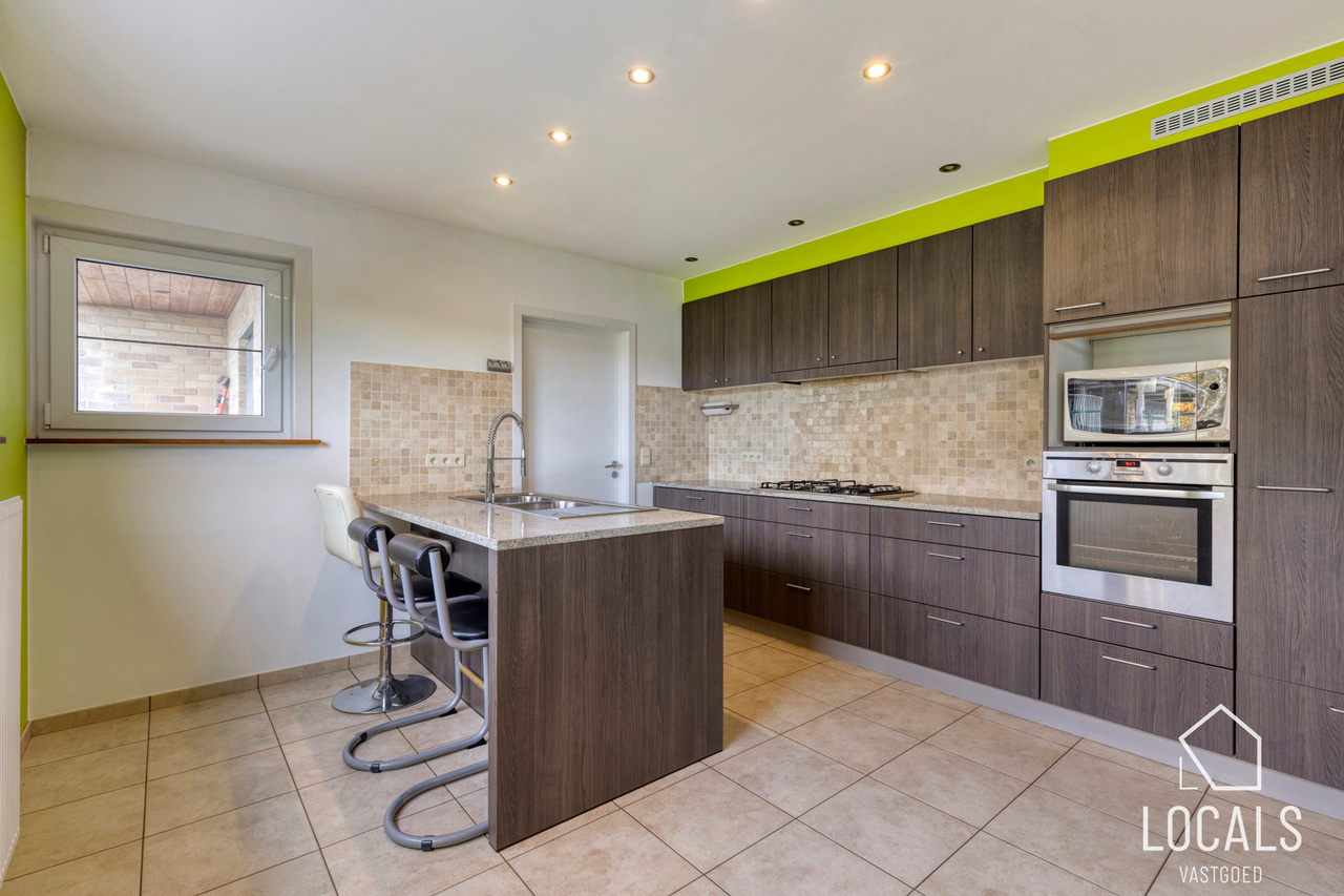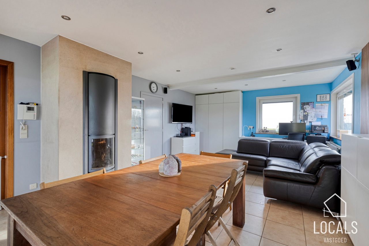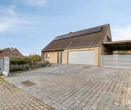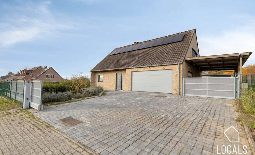 De woning werd voorzien van een dubbele oprit met sectionaalpoort, een carport en een dubbele garage – ideaal voor wie meerdere wagens veilig en privé wil parkeren. Binnen verwelkomt een praktische inkomhal met gastentoilet u in de lichtrijke leefruimte met bureauhoek, waar grote ramen zorgen voor een prachtig vergezicht over de tuin en de omliggende velden. De volledig uitgeruste keuken vormt samen met de ruime berging/wasplaats (voorzien van douchecabine) en de droge kelder het geheel compleet op het gelijkvloers.