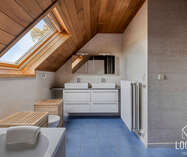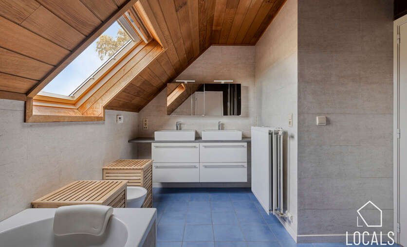 Op de eerste verdieping bevinden zich drie ruime slaapkamers waaronder de master bedroom van 24m² met dressing, een ensuite badkamer uitgerust met dubbele lavabo - grote douchecabine en jacuzzi bad. Verder is er op deze verdieping een tweede toilet en een extra berging. De zolder biedt bijkomende opslagruimte.