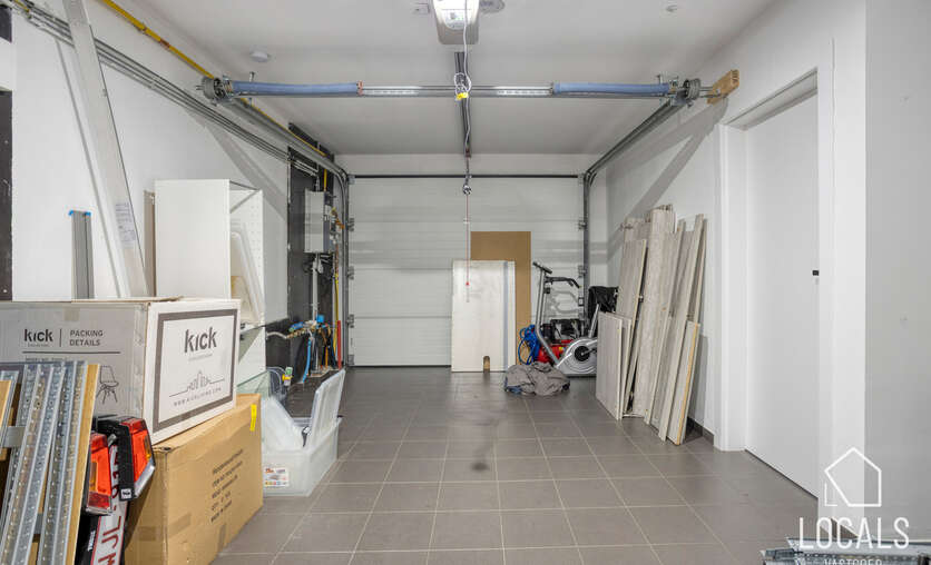 Op het gelijkvloers bevindt zich een gezellige inkomhal met directe toegang tot de ruime garage met automatische poort. Verder is er een lichtrijke leefruimte met grote raampartijen en een halfopen keuken met kwalitatieve toestellen. Een aparte berging zorgt voor extra opbergruimte.