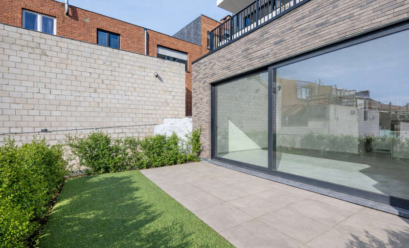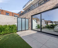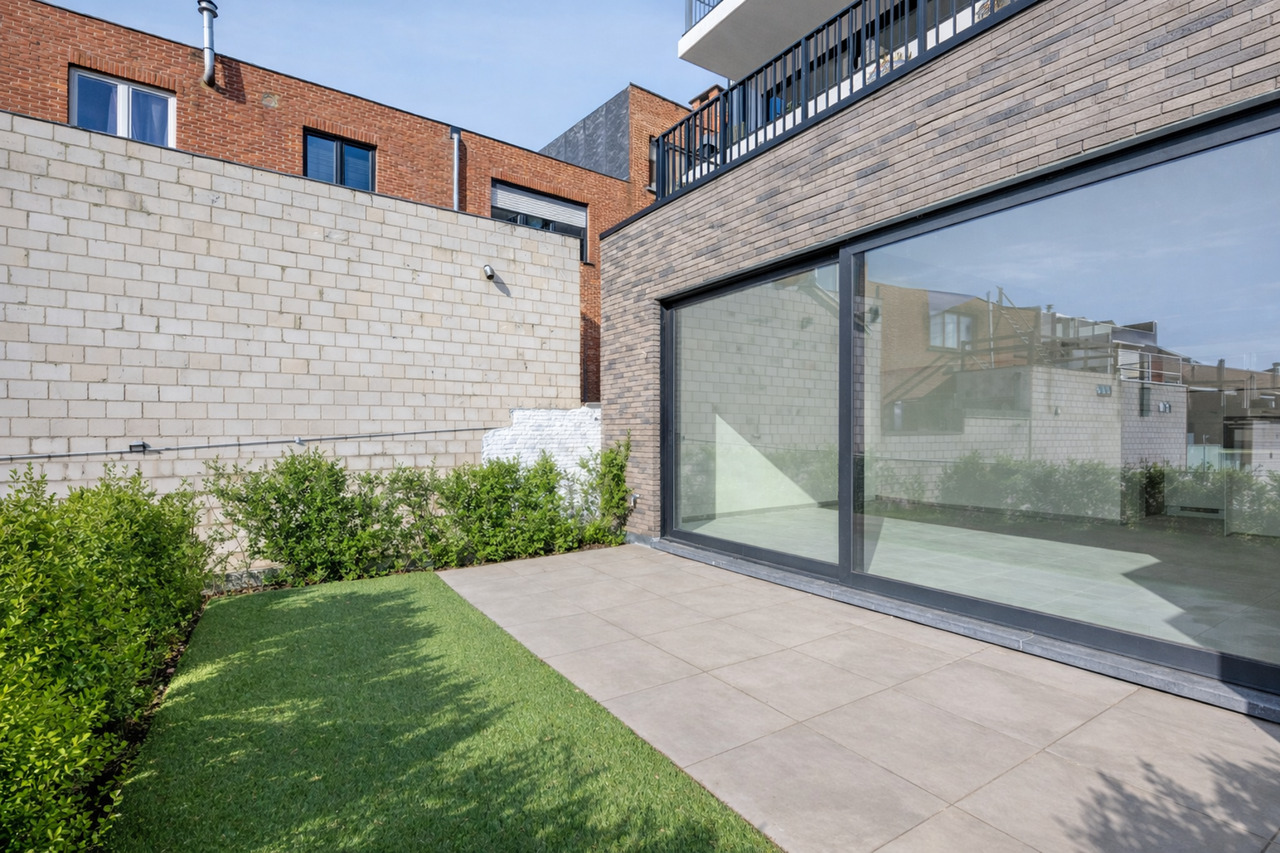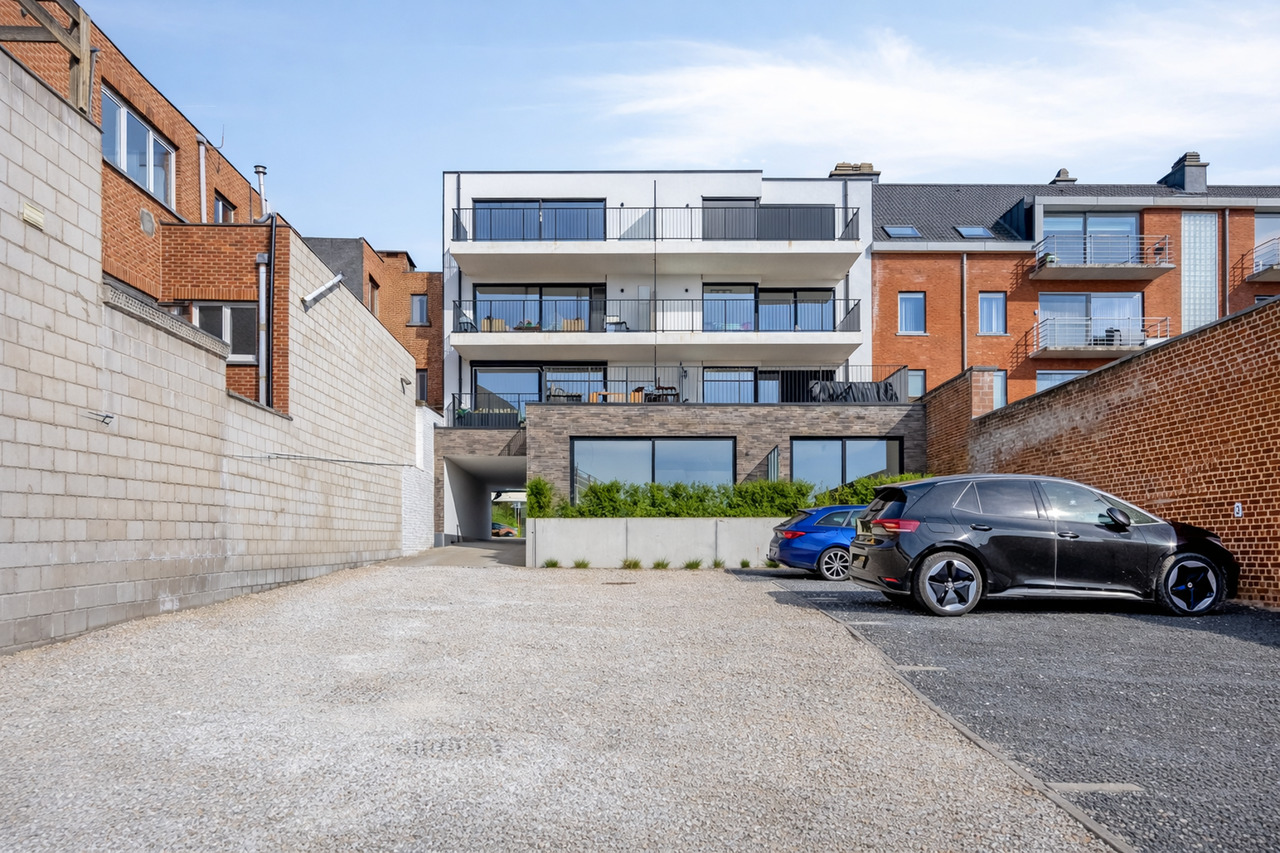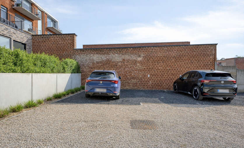 Buiten beschikken de appartementen over een zuidgericht terras met tuintje en achteraan bevindt zich nog een staanplaats (aansluiting laadpaal is reeds aanwezig) en een externe persoonlijke berging.