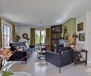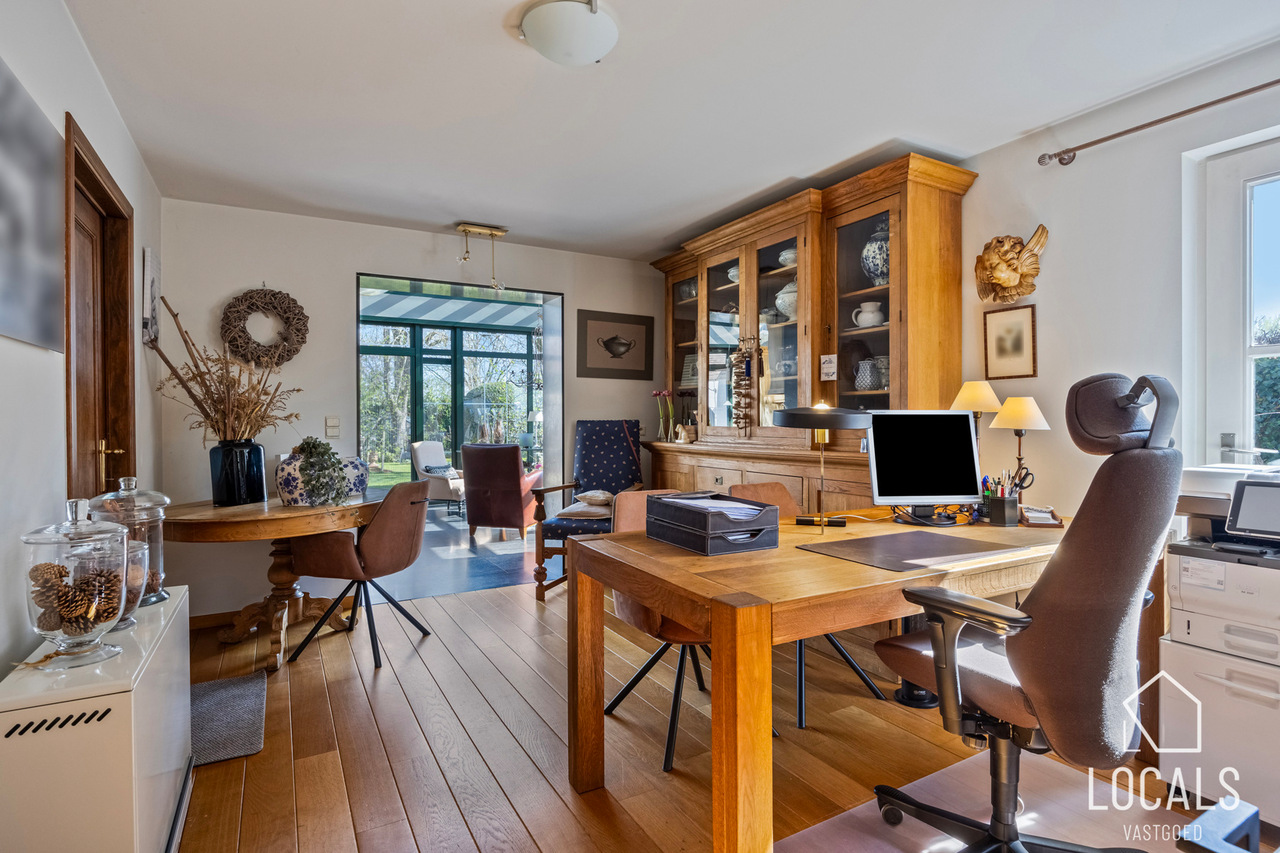 Indeling gelijkvloers: inkom met vestiaire, toilet, bureau/slaapkamer 4, lichtrijke leefruimte met grote eetplaats, 2e bureau/bibliotheek, wasplaats/berging en veranda met Victoriaans dak die directe toegang geeft naar de tuin en de diverse bijgebouwen. Verdieping met nachthal, 2 slaapkamers met daartussen een eerste badkamer. Master bedroom met eigen dressing, badkamer en douchecel. Bergzolder toegankelijk via zoldertrap.
