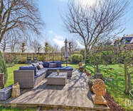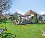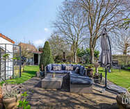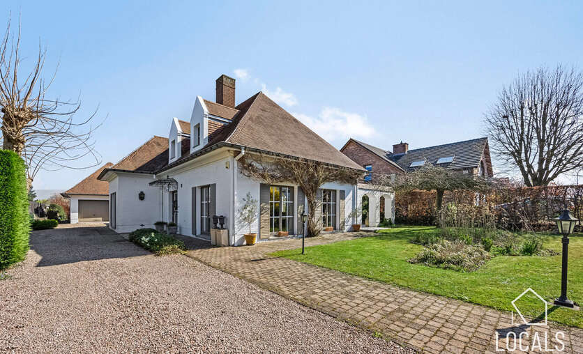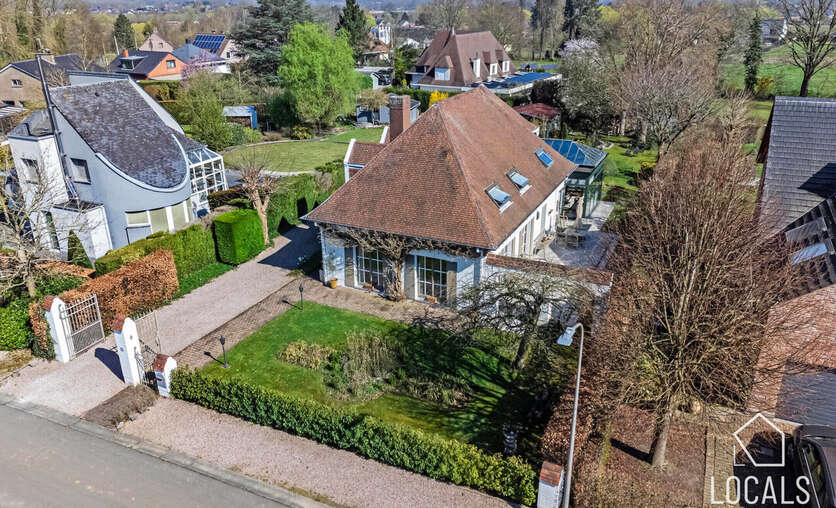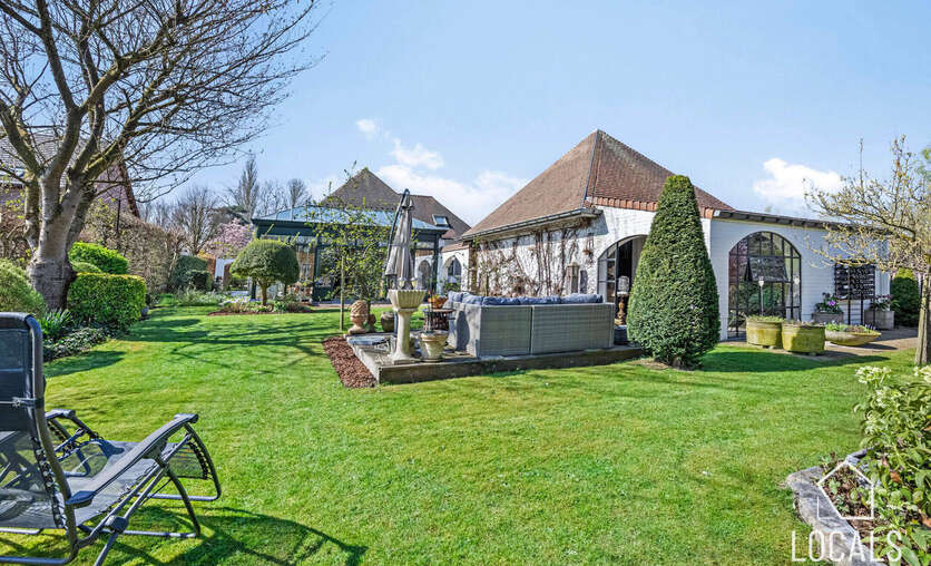 Mooi perceel van 11are 36ca met aangelegde voor- en achtertuin, veel privacy, brede inrit met parking voor meerdere wagens alsook dubbele garage. Rondom de woning liggen 3 terrassen. Daken in Franse tegelpannen (nivernaise).